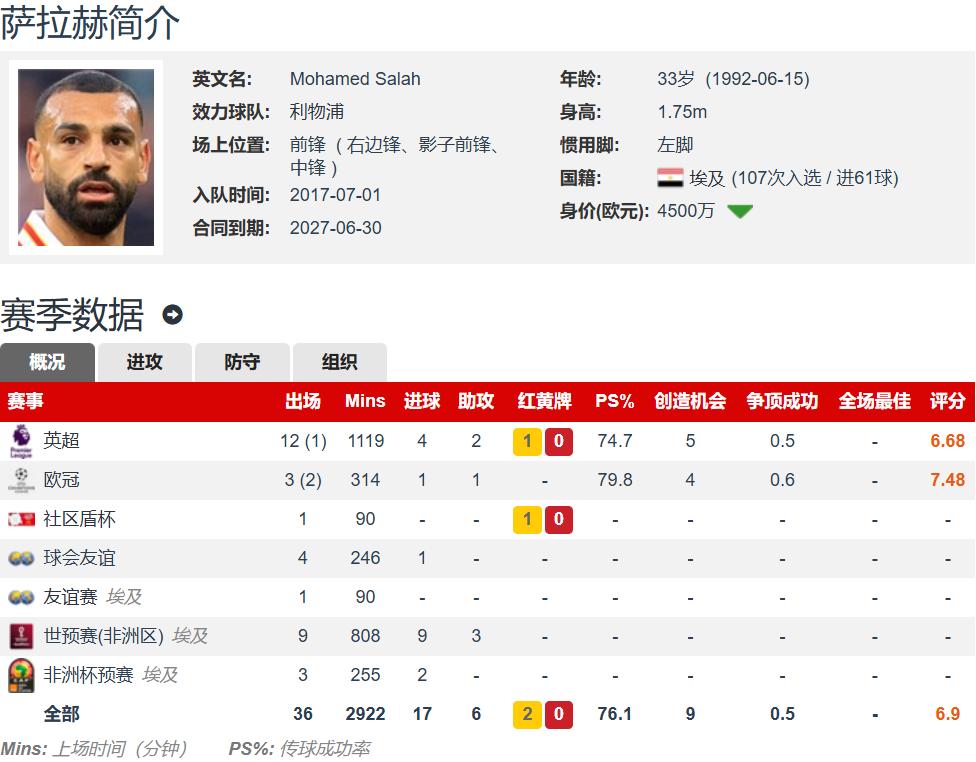 萨拉赫现年33岁,上赛季与利物浦续约两年,合同至2027年,是英超第二高薪球员,周薪40万英镑,仅次于哈兰德的52.5万英镑。萨拉赫上赛季获得英超金靴和助攻王称号,既能传球又能射门。本赛季利物浦的太子和右后卫阿诺德转会皇马,球队未能引进合适的左后卫,无法与萨拉赫形成有效的进攻组合。随着年龄增长,埃及法老状态有所下滑,导致他在前场失误增多且踢球过于个人主义,这些问题被无限放大,最终让萨拉赫坐上了冷板凳。