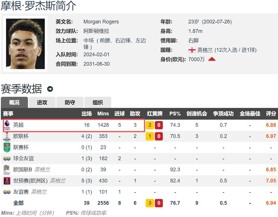 根据数据统计,现年23岁的罗杰斯本赛季参加了全部16场英超比赛,贡献5球3助攻,实际进球数超出预期进球值3.12,位居本赛季英超同期最高。通俗来说,罗杰斯射术高超,尤其擅长远射,几乎每次机会都能转化为进球。